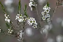 Thryptomene hexandra, commonly known as Palm Valley myrtle in the Northern Territory,[2] is a species of flowering plant in the family Myrtaceae and is endemic to north-eastern Australia. It is an erect, much-branched shrub with linear to lance-shaped leaves and white flowers with six stamens.