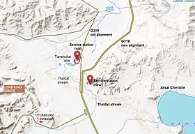 The Xinjiang–Tibet Highway of the 1950s was laid close to the lake, and an army service station was built on its banks, called the Tianshuihai service station.[9][10] Around 2000, an improved national highway (G219) was laid on a new alignment further to the east, and the Tianshuihai service station was moved to a new location, closer to the new alignment.