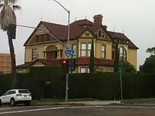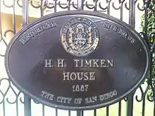 This Queen Anne Victorian house, designed by the prominent architects Comstock and Trotsche, was built in 1888.[1] It was the last residence of inventor Henry Timken (1831-1909). Henry Timken Jr. (grandson of inventor Henry Timken), along with the Putnam sisters, co-founded the Timken Museum of Art in Balboa Park, a short distance from the home. [2] The Timken House became a private residence in 1965.[1]