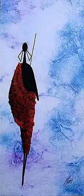 Although the internationally acclaimed Tanzanian artist George Lilanga was not a student of the Tingatinga school nor a member of the Tingatinga Society, he's known to have frequented Tingatinga artists,[14] and some influence of Tingatinga is evident in his work, for what concerns painting (an art form that Lilanga approached in 1974).[15] This influence has been recognised by Lilanga himself in an interview with Kenji Shiraishi, specifically in reference to the use of enamel paint and square hardboards.[16] Besides using materials and techniques originally adopted by Tingatinga painters, Lilanga's art resembles Tingatinga also in its use of vibrant colours[17] and its composition style, that shares the same horror vacui of Tingatinga art. It has been suggested[18] that Lilanga (who was originally a sculptor) actually learnt to paint from Tingatinga painters such as Noel Kapanda and later Mchimbi Halfani, who collaborated with him.[19] The collaboration between Lilanga and Kapanda lasted several years.[20]