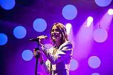 In May 2019, it was announced that Stoessel had joined the reality talent show Pequeños Gigantes Argentina as a judge.[60] The collaboration between Stoessel and Greeicy titled "22" was released on 3 May 2019 as the first single from Stoessel's third album.[61] The song peaked at number eight on Argentina Hot 100 and became Stoessel's first top-ten single on the chart.[62][63] On 14 June 2019, Stoessel was featured on "Sad Song", a collaboration with Swedish DJ Alesso.[64] On 26 July 2019, Stoessel released "Suéltate el Pelo" as the second single from her third album, as well as part of promotion for Pantene.[65] On 6 September 2019, Stoessel released "Fresa", a collaboration with Colombian singer Lalo Ebratt, as the third single from her third album.[66] The song peaked at number three on Argentina Hot 100, becoming Stoessel's first top-five single on the chart.[67][68][69] On 11 October 2019, Stoessel released "Oye", a duet with Sebastián Yatra, as the fourth single from her third album.[70] The song debuted at number three on Argentina Hot 100, becoming Stoessel's second top-five single on the chart in a row.[68] The single became the third song in the history of the chart to achieve a debut at No. 3, and made Stoessel the only female to debut two songs in the top-5 on the AR Hot chart. On 10 January 2020, Stoessel released "Recuerdo", a collaboration with Venezuelan duo Mau y Ricky, as the fifth single from her third album.[71]