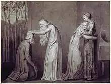 Tiriel is a narrative poem by William Blake, written c.1789. Considered the first of his prophetic books, it is also the first poem in which Blake used free septenaries, which he would go on to use in much of his later verse. Tiriel was unpublished during Blake's lifetime and remained so until 1874, when it appeared in William Michael Rossetti's Poetical Works of William Blake.[1] Although Blake did not engrave the poem, he did make twelve sepia drawings to accompany the rough and unfinished manuscript, although three of them are considered lost as they have not been traced since 1863.[2]