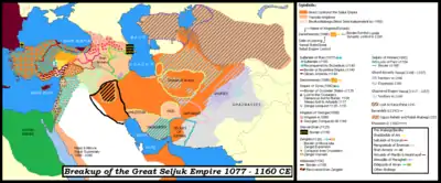 The Great Seljuk Empire, founded by Tughril and significantly expanded by Alp Arslan, stretched from Anatolia and Syria in the west to the Ghaznavid Empire in the east, from the Black and Caspian Sea and the Syr Darya in the north and Persian Gulf in the south.[4][5] The empire had fragmented when Arslan Shah II assumed the throne in 1161. He nominally reigned over the territories in Azerbaijan, Iraq and western Persia and was dependent on the loyalty of independent Amirs like Eldiguz to enforce his authority. Atabegs like the Eldiguzids (Atabegs of Azerbaijan), Salghurids (Atabegs of Fars), Hazaraspids (Atabegs of Luristan), Atabegs of Yazd, Zengids, (Atabegs of Mosul) and Ahmadilis (Atabegs of Maragha), who were initially tutors of young Seljuk princes in their assigned iqtas, and exercised power on their behalf, ultimately took over control of the iqtas for themselves,[6][7] ruled their lands independently with nominal allegiance to the Sultan,[8] fought and allied with each other to install and depose Seljuk princes to the throne, and increased their lands at the expense of the imperial domain. Syria was lost to the Zangids, Palestine and much of Lebanon to the Crusaders, other Seljuk families controlled Anatolia, Kerman, the eastern lands were taken over by the Ghurid Empire, the Khwarazmian dynasty and the Qara Khitai after the defeat of Seljuk Sultan Ahmed Sanjar in the Battle of Qatwan in 1141 and the Oghuz rebellion in 1153.