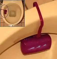 A toilet rim block is a substance in the shape of a block that is used in flush toilets, which slowly dissolves in water. The blocks usually come in a small holder that is attached over the rim of a toilet and hangs down into the bowl, so as the toilet gets flushed, the water passes through the holder coming into contact with the block. With "liquid rims", however, liquid is held in a small bottle above—and connected to—the holder that slowly releases into the bottom of the holder (which is beneath the toilet rim), and so coming into contact with the water when the toilet is flushed.
