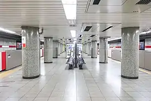 The two Keiyō Line platforms serving four tracks are four stories below ground some hundreds of meters to the south of the main station with moving walkways to serve connecting passengers.