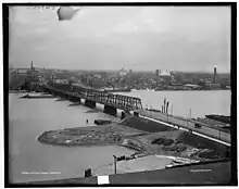 In 1824, the Ohio state legislature authorized the construction of the Miami and Erie Canal, and in 1833, its Wabash and Erie Canal extension. The canal's purpose was to connect the city of Cincinnati to Lake Erie for water transportation to eastern markets, including to New York City via the Erie Canal and Hudson River. At that time, no highways had been built in the state, and goods produced locally had great difficulty reaching the larger markets east of the Appalachian Mountains. During the canal's planning phase, many small towns along the northern shores of the Maumee River heavily competed to be the ending terminus of the canal, knowing it would give them a profitable status.[13] The towns of Port Lawrence and Vistula merged in 1833 to better compete against the upriver towns of Waterville and Maumee.