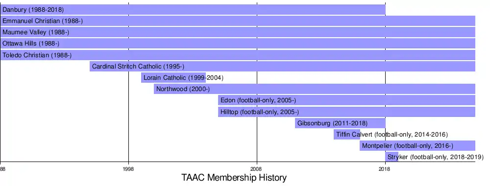 The TAAC began in 1988 when long-time rivals Danbury, Emmanuel Christian (then known as Emmanuel Baptist), Maumee Valley, and Ottawa Hills joined together with the recently expanded Toledo Christian (formerly McAuley High School) to compete in basketball. When Cardinal Strich joined in 1995 after going without sports for a while, the league teamed with the Buckeye Border Conference to create the 12-team Toledo Buckeye League, which involved cross-over games with both leagues' members.[3] This setup only lasted until June 1998, but both leagues continue to have members compete against each other.[4]