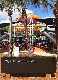 One of the new attractions in the playground area was a spherical play structure which was named "Wyatt's Wonder Web" in Wyatt's honour.[24] At the official reopening, Wyatt was also presented with a 1:36 miniature replica of one of the new colourful leaf statues which had been erected at the main entrance to Kershaw Gardens.[25]
