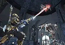 Too Human is an action role-playing game from a third-person perspective. The player takes control of the lead character Baldur in a third-person perspective with the camera distance being adjustable, even controllable during some in-game cinematics to involve the player in the story further.[3] Camera control is limited to the player, with the choice to re-adjust the camera back to its default third-person view being the primary feature following the player and swinging when the player does the same, similar to an auto targeting system.[3] This is because the right analog stick is used for melee combat, instead of traditional camera control, with certain attacks and combos being executed by pushing the stick in the direction of the target with follow-up stick movements applying further attacks with projectile attacks only using an auto lock-on system.[3] Attacks can be combined to execute attacks such as performing combos on enemies in mid-air, attack slides, and juggling foes in the air with projectile weapon attacks.[4] Another aspect of combat are "Ruiner" attacks, powerful abilities that can indirectly affect surrounding enemies and can be mixed with other attacks to perform finishing strikes.[5]