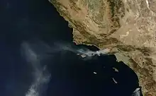 ![]() A NASA satellite image of the Topanga Fire as seen from space, on September 29, 2005. | |