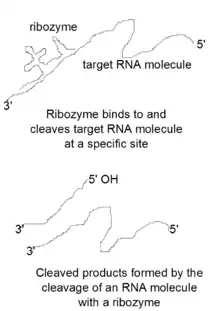 The general catalytic mechanism used by ribozymes is similar to the mechanism used by protein ribonucleases.[10] These catalytic RNA molecules bind to a specific site and attack the neighboring phosphate in the RNA backbone with their 2' oxygen, which acts as a nucleophile, resulting in the formation of cleaved products with a 2'3'-cyclic phosphate and a 5' hydroxyl terminal end.[10] This catalytic mechanism has been increasingly used by scientists to perform sequence-specific cleavage of target mRNA molecules. In addition, attempts are being made to use ribozymes to produce gene silencing therapeutics, which would silence genes that are responsible for causing diseases.[11]