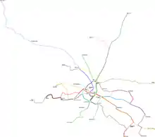 The tramway system is the backbone of public transport in Dresden. DVB operate twelve routes on a 200 km network.[3] On the major lines through the inner city, where different routes intertwine, vehicles run up to every two minutes. Different routes can be identified by a route number scheme, which also extends to local and regional bus services, as well as a colour code which has by now only been applied to the official network diagram of DVB. On all tramway routes, a general 10-minute headway is offered on weekdays, extending to 15 minutes on Saturday, Sunday and in the evening. The system boasts a daily 24 hour service.