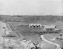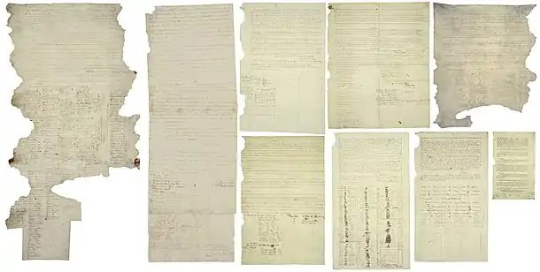 In 1841, treaty documents, housed in an iron box, narrowly escaped damage when the government offices at Official Bay in Auckland were destroyed by fire.[81] They disappeared from sight until 1865 when a Native Department officer worked on them in Wellington at the request of parliament and produced an erroneous list of signatories. The papers were fastened together and then deposited in a safe in the Colonial Secretary's office.[94]