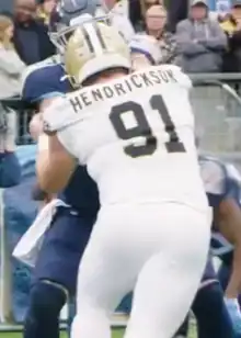 In Week 9 of the 2020 season against the Tampa Bay Buccaneers on Sunday Night Football, Hendrickson recorded two sacks on Tom Brady during the 38–3 win.[18] In Week 15 against the Kansas City Chiefs, Hendrickson recorded two sacks on Patrick Mahomes, including a strip sack that was recovered by the Saints, during the 32–29 loss.[19] He finished the 2020 season with 13.5 sacks, 25 total tackles, one pass defended, and one forced fumble.[20] He was ranked 73rd by his fellow players on the NFL Top 100 Players of 2021.[21]