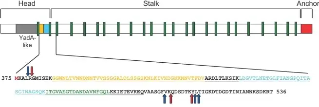 The protein domain arrangement of the Trimeric Autotransporter Adhesin, BadA[1] This figure shows the head, stalk and anchor domains. It shows the YadA-like head in grey. The stalk contains repeats coloured in green and the membrane anchor in red. The sequence below shows colouring according to domain arrangement and protease cleavage sites red (trypsin) and blue (chymotrypsin). (Figure used from open access journal, in the public domain, Public Library of Science (PLoS) Pathogen