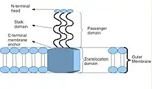 Most TAAs have a similar protein structure. When observed with electron microscopy, the structure has been described as a "lollipop" shape consisting of an N-terminal head domain, a stalk domain, and a C-terminal membrane anchor domain.[2] Often, the literature refers to these as Passenger domain, containing the N-terminal, head, neck, and coiled-coil stalk, and the Translocation domain, referring to the C-terminal membrane anchor. Although all TAAs carry a membrane anchor in common, they may not all contain both a stalk and a head as well. In addition, all membrane anchor domains are of the left-handed parallel beta-roll type.[4]