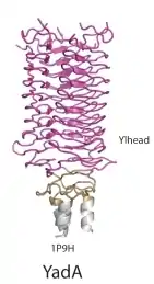 YadA is a protein domain found in Gram-negative bacteria such as Yersinia enterocolitica, Yersinia pestis, and Yersinia pseudotuberculosis. YadA stands for Yersinia adhesin protein A. This protein domain is an example of Trimeric Autotransporter Adhesins, and it was the first TAA to be discovered.[26] Like other TAAs, YadA also undergoes homotrimerisation to form a stable collagen-binding protein.[8] Homotrimerisation is a process whereby three of the same subunits, associate to make a complex of three identical YadA proteins. Furthermore, just like other TAAs, it has a head-stalk-anchor protein architecture.[9] The majority of TAAs share strong similarity in the C-terminal membrane anchor region, the only member to differ across TAAs is the head, neck, and stalk regions. The head region of YadA is composed of beta-helices further folded to create a nine-coiled left-handed parallel beta-roll (LPBR).[8]