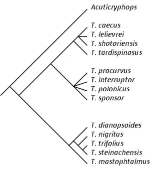 Acuticryphops is probably ancestral to Trimerocephalus, and mainly differs from its descendants in having an eye lobe with a small number of lenses. Crônier, 2003, erected the subgenus Trimerocephalus (Trifoliops) containing T. trifolius and T. nigritus.[1] In order not to be polyphyletic, T. (Trifoliops) would need to include at least T. steinachensis, and preferably T. dianopsoides as well. These species are in the same clade as T. mastophtalmus however, which is the type of the genus Trimerocephalus, which would by definition be in the nominal subgenus Trimerocephalus (Trimerocephalus). This in turn would prompt the erection of another subgenus with all remaining species shown in the cladogram.