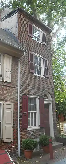 A Trinity house, also known as a band-box house or a Father, Son & Holy Ghost house, is a small townhouse, principally found in Philadelphia, Pennsylvania.[1] Trinity houses are characterized by small size, with three or four floors vertically stacked, each usually consisting of one principal room, many of which were built in the 18th and 19th centuries. They are joined by small, winding stairways, and have few or no interior doors. The "Trinity" name is derived from three floors, three rooms. Kitchens are usually in the basement, with very low headroom. Houses are typically smaller than 1,000 square feet (93 m2), and about 14 feet (4.3 m) wide. The selection of furnishings for such houses is strictly limited by the difficulty of moving furniture between floors.[2][3][4]