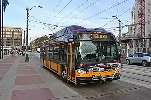 After the results of the evaluation, Metro placed an order in June 2013 with New Flyer for 141 Xcelsior trolleybuses to replace the Gillig and Breda trolleybuses.[29] The Xcelsior XT40 and XT60 are the first trolleybuses in King County Metro's fleet to have a low floor design, a wheelchair ramp (instead of a lift), air conditioning and an auxiliary power unit (that allow buses to operate off-wire for at least 3 miles).[32] Metro says that the New Flyer buses use 25 to 30 percent less energy than the electric trolley buses they replaced, partly because of a regenerative braking system will allow coaches to capture the energy generated during braking and feed it back into the overhead wires.[29] The Xcelsior trolleybuses have a distinct purple and yellow livery, that distinguish them from Metro's hybrid diesel-electric and diesel-powered buses.[33]