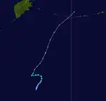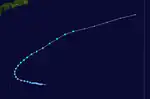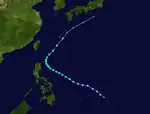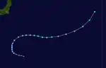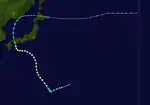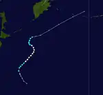 A tropical disturbance developed on January 8 to the southwest of Palau.[1] By the next day, the disturbance was upgraded to a tropical depression and to a tropical storm. Wanda reached its peak intensity on January 10 as a 65 mph tropical storm. The storm was then downgraded to a tropical depression on January 11. Wanda then dissipated on January 14.[3]