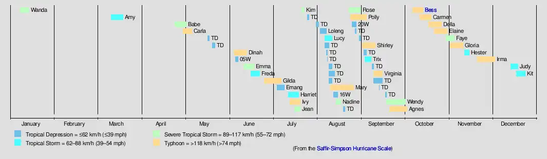 | Agnes | September 21 – October 3 | Typhoon | 195 km/h (121 mph) | 960 hPa (28.35 inHg) | None | None | None | |