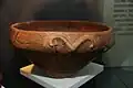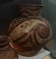 Characteristically vessels were elaborately decorated with swirling patterns and intricate designs. Sometimes decorative incisions were added prior to firing, and sometimes these were filled with coloured dye to produce a dimensional effect. In the early period, the colours used to decorate pottery were limited to a rusty-red and white. Later, potters added additional colours to their products and experimented with more advanced ceramic techniques.[7] The pigments used to decorate ceramics were based on iron oxide for red hues, calcium carbonate, iron magnetite and manganese Jacobsite ores for black and calcium silicate for white. The black pigment, which was introduced during the later period of the culture, was a rare commodity: taken from a few sources and circulated (to a limited degree) throughout the region. The probable sources of these pigments were Iacobeni in Romania for the iron magnetite ore and Nikopol in Ukraine for the manganese Jacobsite ore.[46][47] No traces of the iron magnetite pigment mined in the easternmost limit of the Cucuteni–Trypillia region have been found to be used in ceramics from the western settlements, suggesting exchange throughout the entire cultural area was limited. In addition to mineral sources, pigments derived from organic materials (including bone and wood) were used to create various colours.[48]