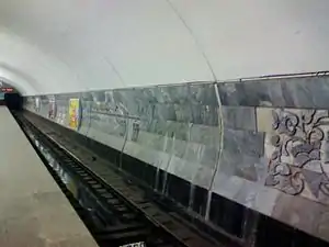 The station is lain shallow underground and is a single-vault design with a rounded ceiling. The station itself was designed by V.A. Spivachuk, and engineered by P.D Pashkov and Y.V. Lysenko. The partitions tracks have been held by grey marble, which has been introduced in traditional Ukrainian folk relief designs. The floor has been paved with multi-coloured polished granite, which is reminiscent of a carpet-like design.