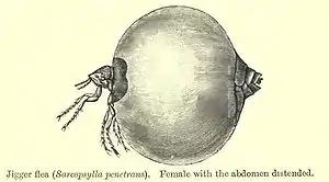 Tungiasis is an inflammatory skin disease caused by infection with the female ectoparasitic Tunga penetrans, a flea also known as the chigoe, chigo, chigoe flea, chigo flea, jigger, nigua, sand flea, or burrowing flea (and not to be confused with the chigger, a different arthropod). The flea and the disease that it causes are found in the tropical parts of Africa, the Caribbean, Central and South America, and India. Tunga penetrans is the smallest known flea, measuring 1 mm across. It is also known in Latin America as the nigua and bicho de pie (Spanish) or bicho de pé (Portuguese), literally "foot bug".[3][4] Tunga penetrans is a member of the genus Tunga, which comprises 13 species.[5][6]