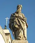 Baruch holds forth a parchment whose quotations are a synthesis of several passages of his book. The sculpture, located on the pedestal that finishes off the wall alignment of the central courtyard, is a young and beardless figure, clad in short tunic, cloak, and boots. He wears a turban decorated with a brim similar to that of the prophet Jeremiah. With one hand he holds the folds of his mantle, while in the other he bears the parchment.[9] The piece, with its squat proportions and anatomical errors evident, is one of the weakest of the set. As with the other figures, however, the strength of the image comes from the expression on his face.