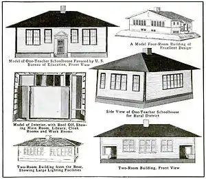 In the early 20th century, the United States Bureau of Education made scale models of one, two, and four room schoolhouses available to rural communities by parcel post. The models were sufficiently detailed that "any competent carpenter" could replicate the model in full-size.[5]: 59 The program was designed to aid small districts that could not afford to pay architects to develop plans for schools with modern standards of "health and efficiency". In 1914, at the program's initiation, it was estimated that there had been 212,000 rural schools built in the United States, most of which had been planned without "any regard to light, ventilation, or sanitation".[5]: 59