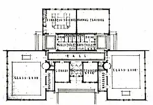 North Carolina issued a guide in 1914 with a floorplan of a similar two-room school with the same layout of a front entrance into a vestibule, two coatrooms off the vestibule, and a large room divided by a moveable wall into two 26 ft × 32 ft (7.9 m × 9.8 m) classrooms.[2]: 125