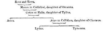 According to Herodotus in the first chapter of the Histories, Tyllus was the father of Halie,[5] who married Cotys,[4] a son of Manes, an early king of Lydia. The children of Halie and Cotys (the grandchildren of Tyllus) were Atys and Asies, after whom the Lydians claim the continent of Asia was named.[6] Atys, after his father died, became king of Lydia. Atys had two sons, Lydus[7] and Tyrrhenus,[3] after whom, according to the Greeks, the Lydian people[7] and the Tyrrhenians (the Etruscans) were named, respectively.[5]