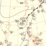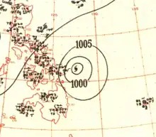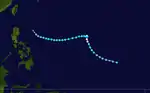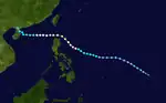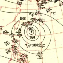 In late April, a well-developed tropical wave began developing east of Chuuk Lagoon.[9] Tracking westward, the easterly wave was analyzed to have organized into a tropical depression by 0000 UTC on April 29.[10] Twelve hours later, Iris was estimated to have strengthened into a tropical storm.[11] At roughly the same time, a vessel in the vicinity of the storm reported winds in excess of 65 km/h (40 mph), prompting the Guam Fleet Weather Center to initiate reconnaissance flights into the cyclone.[7] Midday on April 30, Iris intensified into the equivalent of a modern-day typhoon as it moved in a slightly oscillatory path towards the Philippines.[7][11] After a slight fluctuation in intensity during the overnight hours of May 1, Iris rapidly intensified to reach its peak intensity with a minimum pressure of 909 mbar (909 hPa; 26.8 inHg) and maximum sustained winds of 280 km/h (170 mph) early on May 4,[11] making it the equivalent of a Category 5 super typhoon;[10] at the time this was the first confirmed instance of a typhoon reaching such intensities.[2] Afterwards, Iris weakened slightly before making landfall on South Luzon around 1800 UTC the following day.[11]