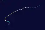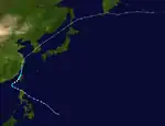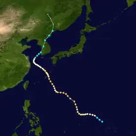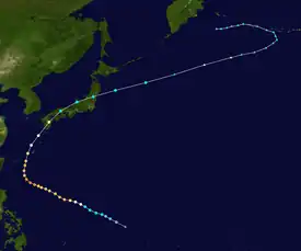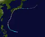 A disturbance was first noted in the vicinity of Micronesia on June 17 approximately 400 km (250 mi) south of Guam. Aircraft traversing between Guam and the Philippines eventually confirmed the presence of a developing tropical depression by June 25, tracking towards the west.[7] By the following day, the system had strengthened into a tropical storm. The system curved towards the north by June 28 and had begun to trend towards the northeast thereafter, gradually strengthening to a typhoon by 18:00 UTC that day. The storm continued to accelerate towards the northeast, passing just east of the Ryukyu Islands on June 30 before reaching peak intensity offshore Kyushu with maximum sustained winds of 185 km/h (115 mph) and a central pressure estimated at 975 mbar (975 hPa; 28.8 inHg). Kate weakened slightly before making landfall the following day on Shikoku with winds of 170 km/h (110 mph).[16] The typhoon curved eastward and continued to weaken, tracking through Sagami Bay and emerging over the Pacific Ocean on July 2 as a tropical storm.[7][16] Kate transitioned into an extratropical cyclone and would later dissipate the following day.[17]