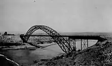 In the early days, National Old Trails Road traffic crossing the river utilized a ferry crossing between Topock and Needles on the California side of the river. The ferry, established in 1890, was used until 1914, when a river flood destroyed it. In response, the upstream Red Rock Bridge, owned by the Santa Fe Railway, became the new river crossing for National Old Trails Road motorists.[9] The railroad had allowed cars to use the bridge so long as the drivers were willing to pay a toll.[26] Construction started on the Old Trails Bridge, a dedicated automobile bridge, on June 30, 1915, and was completed several months later on February 20, 1916. The bridge was paid for by the states of California and Arizona as well as the Bureau of Indian Affairs at a cost of $75,000 (equivalent to $1.3 million in 2021[28]). The bridge itself was a steel arch structure designed by San Bernardino County surveyor S. A. Sourwine.[29] Once construction on the Old Trails Bridge had been completed, National Old Trails Road traffic was moved onto the new bridge and the Red Rock Bridge became train only once again.[9] From 1916 to 1928, the Old Trails Bridge held the record of being the longest three-hinged arch bridge in the United States.[9]