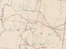 Upon leaving Peach Springs, US 66 curved southeast into the Hualapai Indian Reservation. Shortly afterwards, the highway left Mohave County and continued east into Coconino County. Shortly after entering Coconino County, US 66 entered Yavapai County. The route briefly entered Coconino County again for less than three miles (4.8 km), before crossing into Yavapai County for a second time, where it remained for several miles.[10] This final crossing of the Yavapai–Coconino county line also serves as the present terminus of SR 66. From here on out, US 66 continued southeast as a county-maintained road (known as Crookton Road).[3] This segment was previously the easternmost 16.8 miles (27.0 km) of SR 66, until ADOT retired this section and handed it over to Yavapai County in 1990 for maintenance.[13]