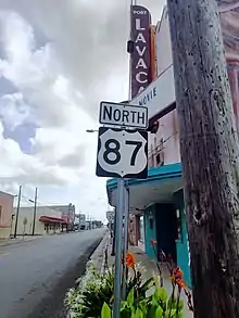 US 87 begins at an intersection with State Highway 238 in Port Lavaca.[1] It takes a northwesterly route out of the town, and travels to Victoria, where it intersects US 59 and US 77.[2] Its northwesterly path continues to Cuero, where it merges with (and is briefly co-signed with) US 77 Alternate and US 183 before turning back toward the north. US 87 follows a gentle northwesterly route until just before Smiley, where it takes a more westerly turn. At Nixon, US 87 merges with State Highway 97 and continues west as a co-signed route until just west of Stockdale, where SH 97 leaves the route and US 87 continues to the northwest to San Antonio.[3]