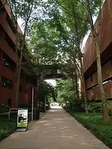 Academic Row is known to be the central pedestrian concourse and maintenance vehicle highway in the campus that borders along a series of buildings. Beginning south at Administration Drive, the pathway is covered by mature trees on either side. Friendly squirrels are a common sight near the University Center where students tend to feed them waffle fries from Chick-fil-A.[39] Academic Row is bordered by the Administration Building, the Retriever Activities Center, Janet and Walter Sondheim Hall, Sherman Hall (Previously named Academic IV), University Center, Math and Psychology Building, Biological Sciences Building, and the Meyerhoff Chemistry Building. At the northern end, the walkway is intersected by Schwartz Breezeway leading to the Commons, the university's student union. Academic Row terminates at the Albin O. Kuhn Library & Gallery, where multiple paths radiate across Erickson Field towards the Commons, the Physics and Public Policy Buildings, West Hills, Hillside, and Terrace Apartments, as well as additional dormitories.[40]