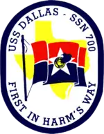 USS Dallas (SSN-700) is a Los Angeles-class nuclear-powered attack submarine of the United States Navy. She was the Navy's second vessel of that name, and the first to be named after the city of Dallas, Texas, although another two ships were scheduled but never completed. On 4 April 2018, after nearly 37 years of commissioned service, the boat was decommissioned at the Controlled Industrial Area of Puget Sound Naval Shipyard. The defueled vessel will eventually undergo recycling.[1][2]