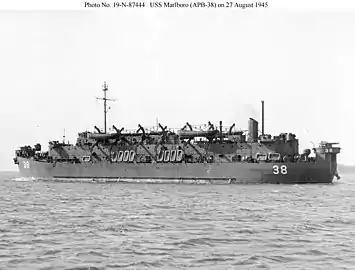 Authorized to be built as APL-38 on 17 December 1943, Marlboro was redesignated APB-38 on 8 August 1944. She was laid down by the Boston Navy Yard at Boston, Massachusetts, on 25 August 1944 and launched on 17 November 1944; sponsored by Mrs. Marjorie Guile. Marlboro was commissioned 18 August 1945. Assigned to the Atlantic Fleet, Marlboro departed Boston 14 September for shakedown in Chesapeake Bay. On 15 October Marlboro got underway from Naval Operating Base, Norfolk, Virginia, for duty with the Service Force out of New York City. She served as a barracks ship along the East Coast to the end of the year. On 8 January 1946, she steamed for the Caribbean, arriving 5 days later at Guantanamo, Cuba, where she remained until sailing 15 May with U.S. Marines embarked for the East Coast. Marlboro reached Norfolk on the 20th.