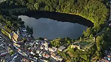 The Ulmener Maar is a maar in the Eifel mountains of Germany in the immediate vicinity of the town of Ulmen in the state of Rhineland-Palatinate. The lake is up to 37 metres deep and is surrounded by an embankment of tuff with an average height of 20 metres, which was formed from the erupted material of the former volcano. By the southern edge of the embankment are the ruins of a knight's castle, Ulmen Castle dating to the 11th century.