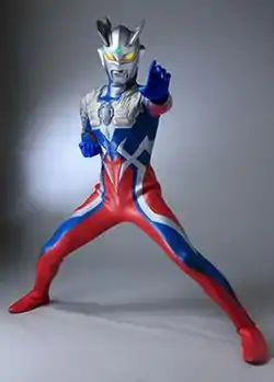 Ultraman Zero was designed by Masayuki Gotoh under the initial draft name Ultraseven Ax (ウルトラセブンアックス, Urutorasebun Akkusu).[4][17] The original design was based on a modernized variation of Ultraseven,[17] being all-red in color and lacked a Color Timer.[18][4] Due to how common the red color is among Ultra Warriors, blue was added as well to make him more attractive to new viewers.[17] His mouth design is similar to Seven, but the whole face is composed of diagonal lines, and it has become possible to show different expressions according to the angle.[4]
