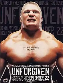 Unforgiven was first held by World Wrestling Entertainment (WWE) as the 21st In Your House pay-per-view (PPV) in April 1998. Following the discontinuation of the In Your House series in February 1999, Unforgiven branched off as its own PPV in September that year, becoming WWE's annual September PPV.[3] The 2002 event was the fifth event in the Unforgiven chronology and took place on September 22 at Staples Center in Los Angeles, California.[4][5] It was also the first held under the WWE name, as the promotion was renamed from World Wrestling Federation (WWF) to WWE in May.[6] It was also the first Unforgiven held during the first brand extension that was introduced in March, a storyline subdivision in which the promotion divided its roster into two separate brands, Raw and SmackDown!, where wrestlers were exclusively assigned to perform.[7] The 2002 event in turn featured wrestlers from both brands.[4]