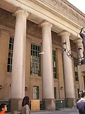 The exterior Front Street façade is laid out in an ashlar pattern, constructed with smooth beige Indiana and Queenston limestone. The colonnaded loggia which faces Front Street features 22 equally spaced Roman Tuscan columns made from Bedford limestone, each 40 feet (12 m) high and weighing 75 tons. Fourteen three-storey bays, each with severely delineated fenestration, form the façade on either side of the central colonnade for a total of 28 bays.[9] The structures at either end have an additional ten bays. Three rectangular windows fill each bay, lighting the interior hall with plenty of natural light. However, the building's external profile is hard and flat, with a line of huge columns, heavy ornamentation and strong symmetry.