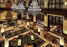 The décor in the hotel includes features like three crystal chandeliers, Italian marble floors, wrought iron accents, oak-accented doors, and three limestone fireplaces, along with a 65-foot, barrel-vaulted, stained glass lobby ceiling.[2][1] The walls are covered with art, including numerous bas-relief sculptures. The two sculptures known as "Miss Nashville" and "Miss Louisville" are said to be images of two of the builder's daughters. Other bas-reliefs depict various historical modes of transportation.[2] Some of the station's original tile remains in the hotel's bar and restaurant area.[12]