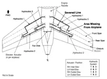 At 15:16, while the airplane was making a slight right turn at its cruising altitude of 37,000 feet (11,000 m), the fan disk of its tail-mounted General Electric CF6-6 engine disintegrated explosively. The uncontained failure resulted in the engine's fan disk departing the aircraft, tearing out components including parts of the No. 2 hydraulic system and supply hoses in the process; these were later found near Alta, Iowa.[1]: 25, 75 Engine debris penetrated the aircraft's tail section in numerous places, including the horizontal stabilizer, severing the No. 1 and No. 3 hydraulic system lines where they passed through the horizontal stabilizer.[1]: 75 [10]