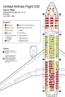 United Airlines Flight 232 was a regularly scheduled United Airlines flight from Stapleton International Airport in Denver to O'Hare International Airport in Chicago, continuing to Philadelphia International Airport. On July 19, 1989, the DC-10 (registered as N1819U) serving the flight crash-landed at Sioux Gateway Airport in Sioux City, Iowa, after suffering a catastrophic failure of its tail-mounted engine due to an unnoticed manufacturing defect in the engine's fan disk, which resulted in the loss of many flight controls. Of the 296 passengers and crew on board, 112 died during the accident,[lower-alpha 1] while 184 people survived. It was the deadliest single-aircraft accident in the history of United Airlines.[3][4]