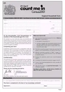 The census was administered through self-completion forms, in most cases delivered by enumerators to households and communal establishments in the three weeks before census night on 29 April. For the first time return by post was used as the main collection method, with enumerators following up in person where the forms were not returned. The postal response rate was 88% in England and Wales,[2] 91% in Scotland,[3] and 92% in Northern Ireland.[4] A total of 81,000 field staff were employed across the UK (70,000 in England and Wales, 8,000 in Scotland and 3,000 in Northern Ireland).[1] The census was conducted at the height of the foot-and-mouth crisis, which led to extra precautions being adopted by the field staff, and suggestions that the census may have to be postponed.[5] However, it was reported that the disease outbreak did not affect the effectiveness of the collection process.[6][7]