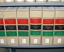 The United States Statutes at Large, commonly referred to as the Statutes at Large and abbreviated Stat., are an official record of Acts of Congress and concurrent resolutions passed by the United States Congress. Each act and resolution of Congress is originally published as a slip law, which is classified as either public law (abbreviated Pub.L.) or private law (Pvt.L.), and designated and numbered accordingly. At the end of a congressional session, the statutes enacted during that session are compiled into bound books, known as "session law" publications. The session law publication for U.S. Federal statutes is called the United States Statutes at Large.[1] In that publication, the public laws and private laws are numbered and organized in chronological order.[2] U.S. Federal statutes are published in a three-part process, consisting of slip laws, session laws (Statutes at Large), and codification (United States Code).